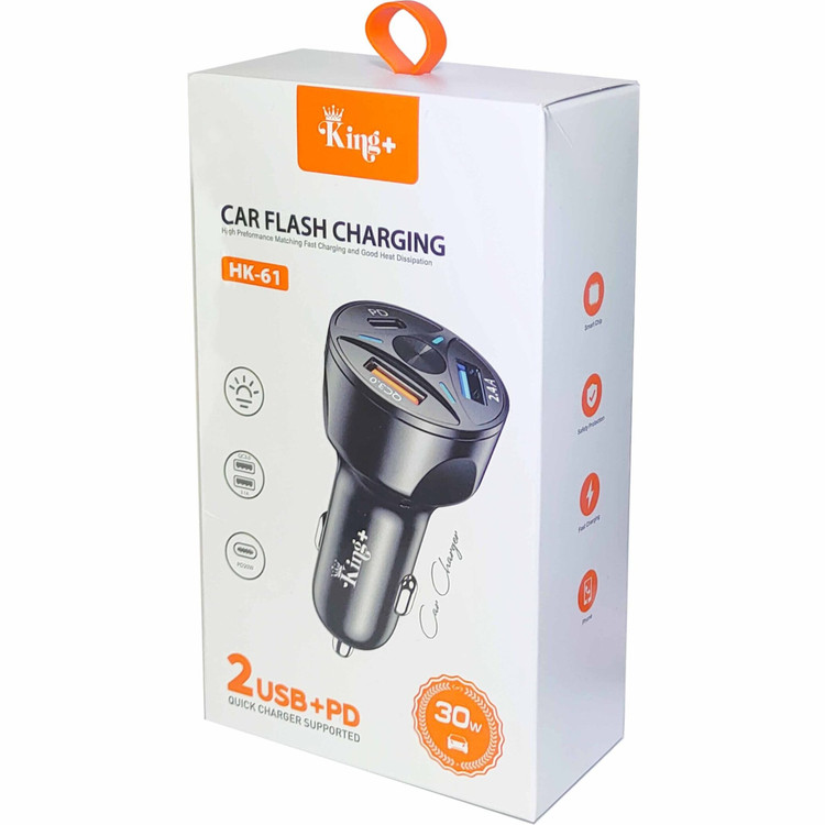 تا سه دستگاه را همزانو بدون دغدغه شارژ کنید و از کیفیت شارژ لذت ببرید.شارژر فندکی کینگ پلاس مدل HK-61 سه پورت خروجی همزان و دو پورت فست شارژ میتواند در هنگام سفر و رانندگی های طولانی نیاز های شما را برطرف کند. پشتیبانی از فناوری PD یکی از قابلیت های مهم این شارژ فندکی میباشد که شما میتوانید تا 20W خروجی برای دستگاه های آیفون از آن بگیرید. دو پورت دیگر این دستگاه یکی فست شارژ برای گوشی های اندرویدی و دیگری شارژ کوییک برای ایرپادو اسپیکر بسیار مناسب میباشد. هم اکنون این محصول با ضمانت و گارانتی معتبر در کینگ پلاس جانبی موجود میباشد.